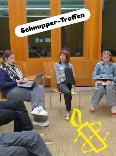 Nachdem eine Grundlage an Informationen über Amnesty International und die JHSG gelegt war, fand ein reguläres Treffen der JHSG statt. So konnten die neuen Teilnehmenden einen Eindruck davon bekommen, wie ein solches Treffen abläuft und was die Arbeit ausmacht. Von der klassischen „W(ie) G(ehts) D(ir)“ Runde, über die Bestimmung einer*s Protokollant*in, das Durchgehen von Anfragen verschiedener Personen und KoGruppen, bis hin zur Aufarbeitung alter Projekte und dem Brainstormen sowie der Planung neuer Ideen, alles wurde gemeinsam erlebt. Das Neuentreffen konzentrierte sich dieses mal auch auf eine mögliche Kooperation mit der Gruppe Israel/Palästina und mögliche Unterschriftsammelaktionen auf Konzerten.